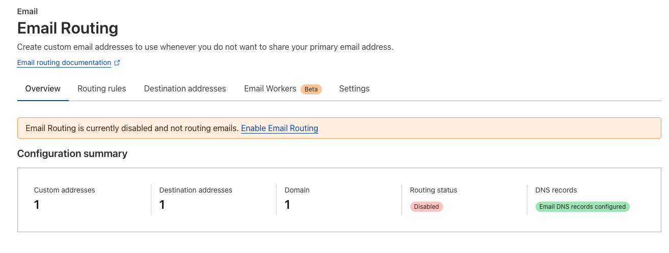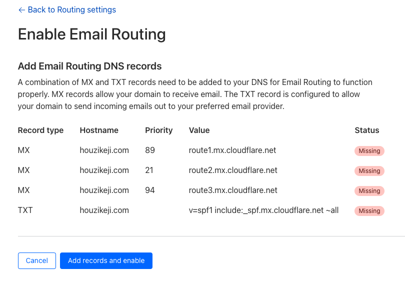点击Enable Email Routing,按页面要求,删除不必要的MX,添加cloudflare的MX添加成功,等待规则同步。验证邮箱