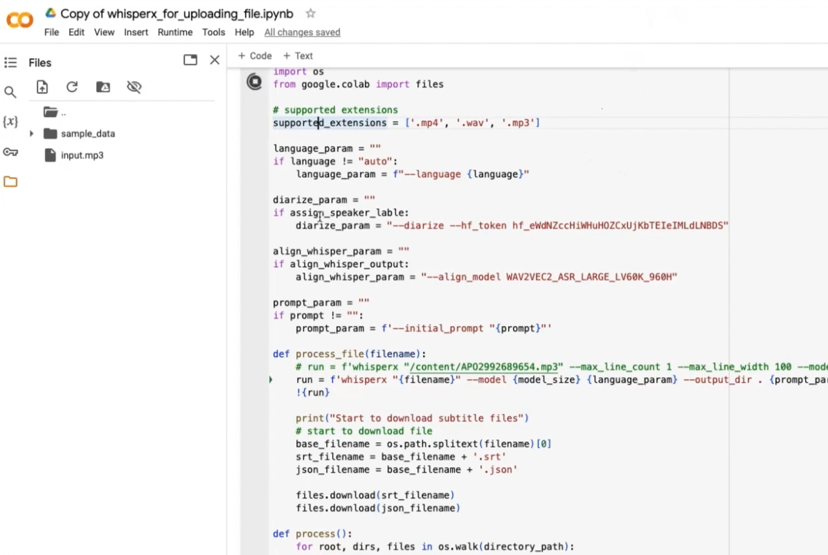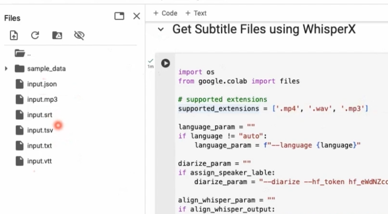 经过一段时间,等环境好了之后,我们在左侧上传.mp3文件,这里注意使用小写,因为代码中匹配的是小写。再次点击运行图标,经过一段时间之后,我们可以看到生成了对应的字幕文件。